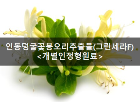 인동덩굴꽃봉오리추출물(그린세라F) * 원료명 : 인동덩굴꽃봉오리추출물(그린세라F)* 식품유형 : 개별인정형 원료* 규격 : 일일섭취량 인동덩굴꽃봉오..