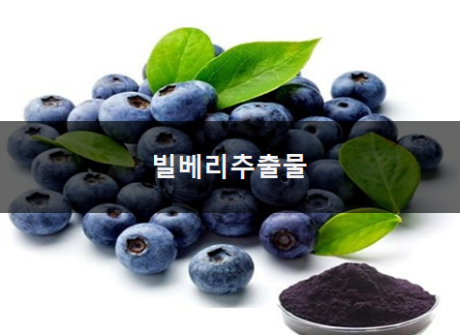빌베리추출물 * 원료명 : 빌베리추출물* 식품유형 : 건강기능식품 원료* 원산지 : 인도* 규격 : 일일섭취량 160~240mg* 특징..
