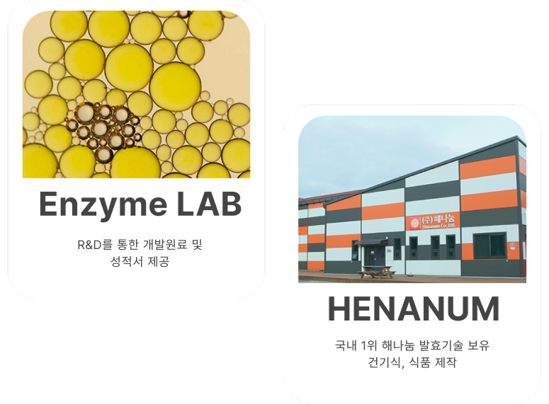 Enzyme LAB의 R&D를 통한 개발원료 및 성적서 제공가능 국내 1위의 해나눔 발효기술 보유